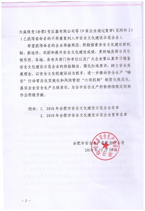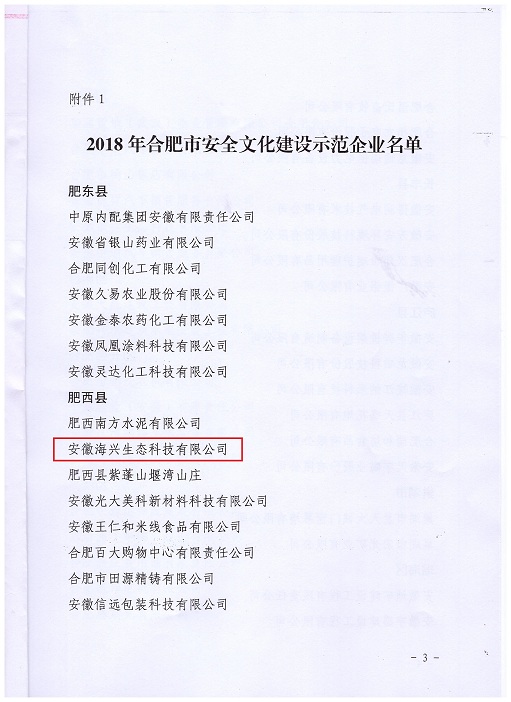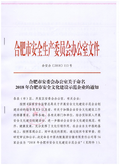 大道至簡,平安是福。近日我司被合肥市安委會辦公室命名為“2018 年合肥市安全文化建設(shè)示范企業(yè)”,這是我司將長期將安全文化建設(shè)納入企業(yè)文化建設(shè)的成果。