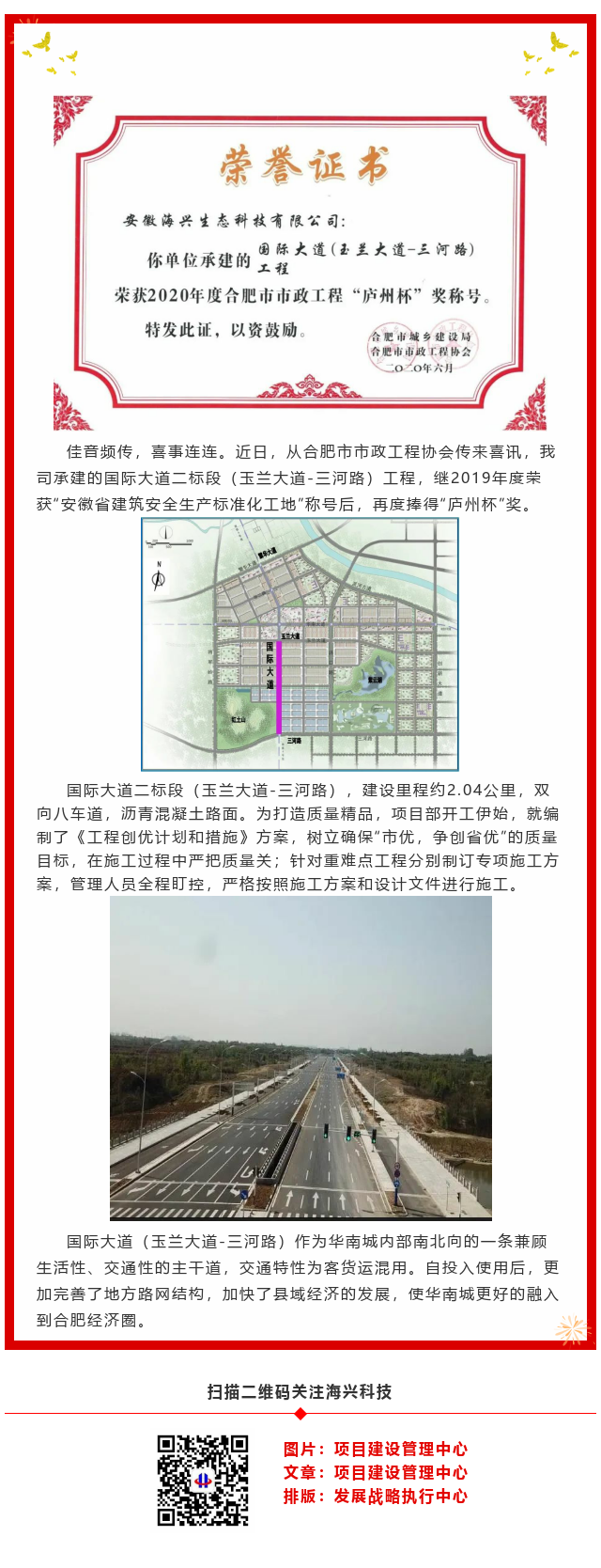 公司國際大道(玉蘭大道-三河路)工程喜獲“廬州杯”獎